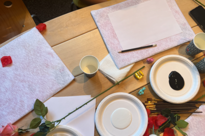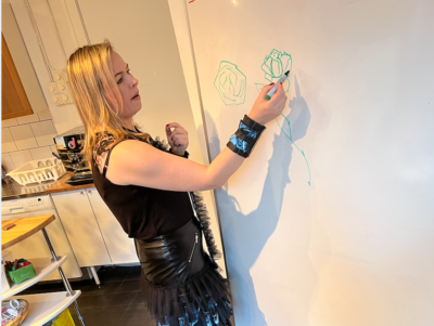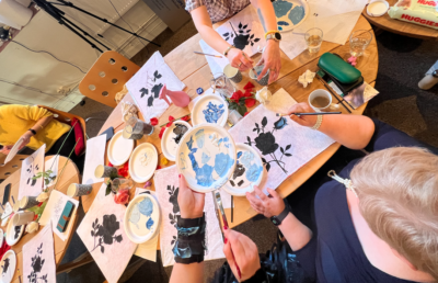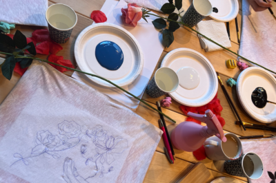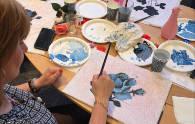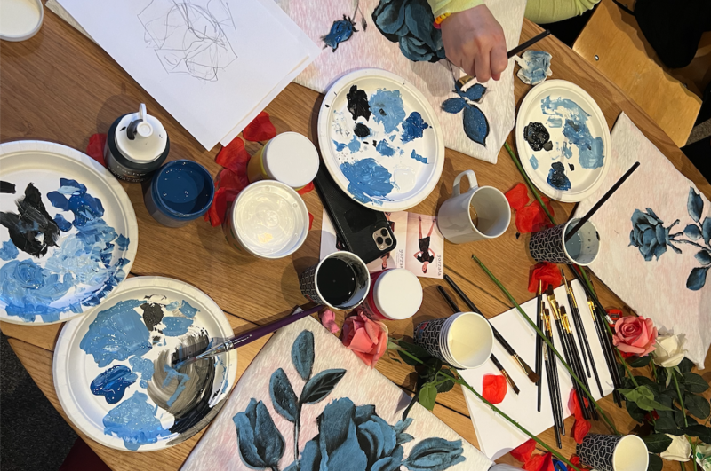 - When everyone had sketched their own creative pattern, Halina then showed the participants how to apply paint to the fabric with brushes. First you fill in and paint the whole pattern with a black color. To create a background. When the black color was completely dry, we poured a small amount of the colors from the chosen palette, which was white and blue to mix three different shades of blue on a separate plate. With different shades of light and dark blue you can create depth and give life to the roses you paint.
