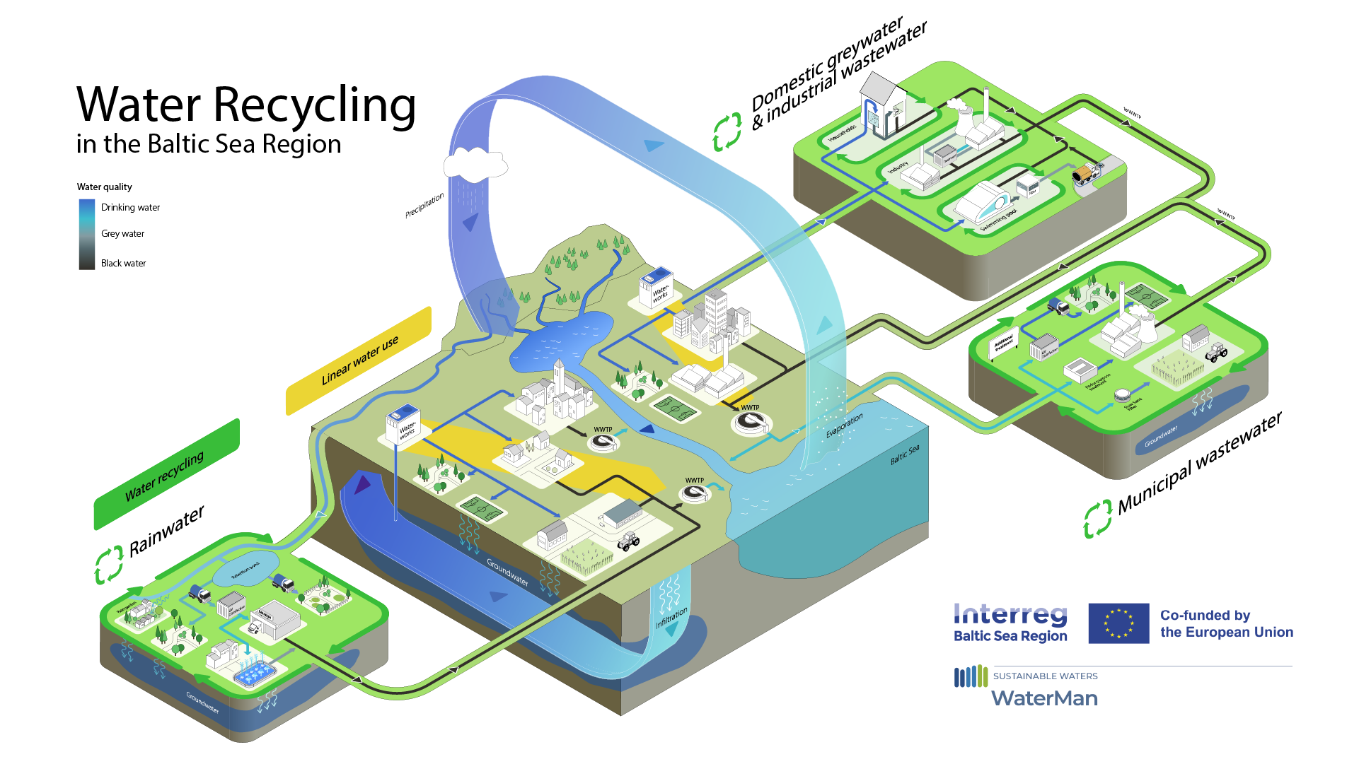 The following overview presents typical use cases and replicable technical-organisational solutions for water recycling in the Baltic Sea Region. They are adapted to its specific conditions and have been piloted, and, in part, field-tested under real-world conditions, within the WaterMan project. Each use case shows a concrete way to reuse treated wastewater or recirculate retained rainwater – from irrigation in agriculture and urban green spaces to industrial applications. Together, they provide practical proof that water recycling works in humid regions – and give municipalities and water companies across the Baltic Sea Region concrete orientation to replicate, transfer and scale these solutions.